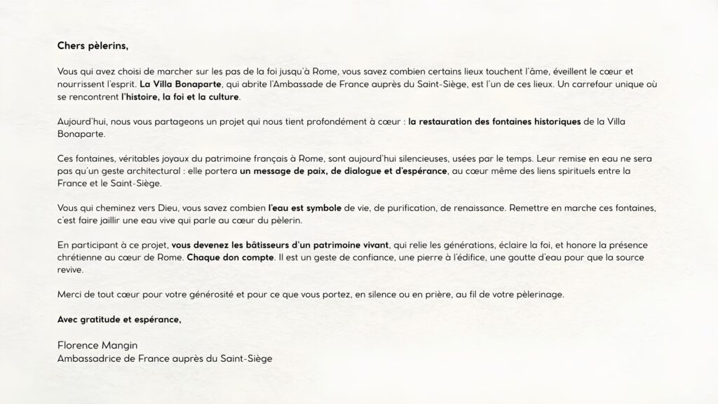 La Villa Bonaparte, lieu emblématique de la présence française auprès du Saint-Siège qui a vu passer des pèlerins du monde entier, porte une histoire unique de diplomatie, de foi et de culture. Aujourd’hui, ses fontaines, symboles de paix et de vie, sont silencieuses. L’ambassade de France auprès du Saint-Siège lance un appel à la générosité pour permettre leur restauration. Cette initiative vise à rendre toute sa beauté à ce lieu au rayonnement spirituel et culturel fort, au cœur de Rome. Nous vous proposons de vous y associer, selon vos moyens, pour faire revivre ce patrimoine porteur de sens.